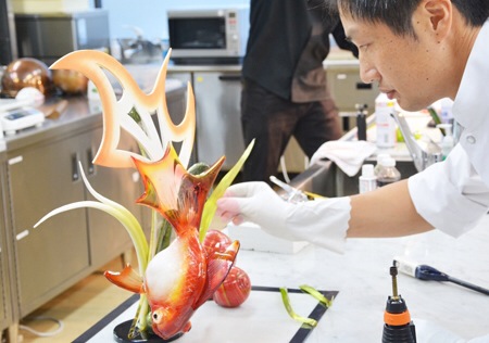 先日の埼玉ベルエポック製菓調理専門学校でのアメ細工の授業の様子です。