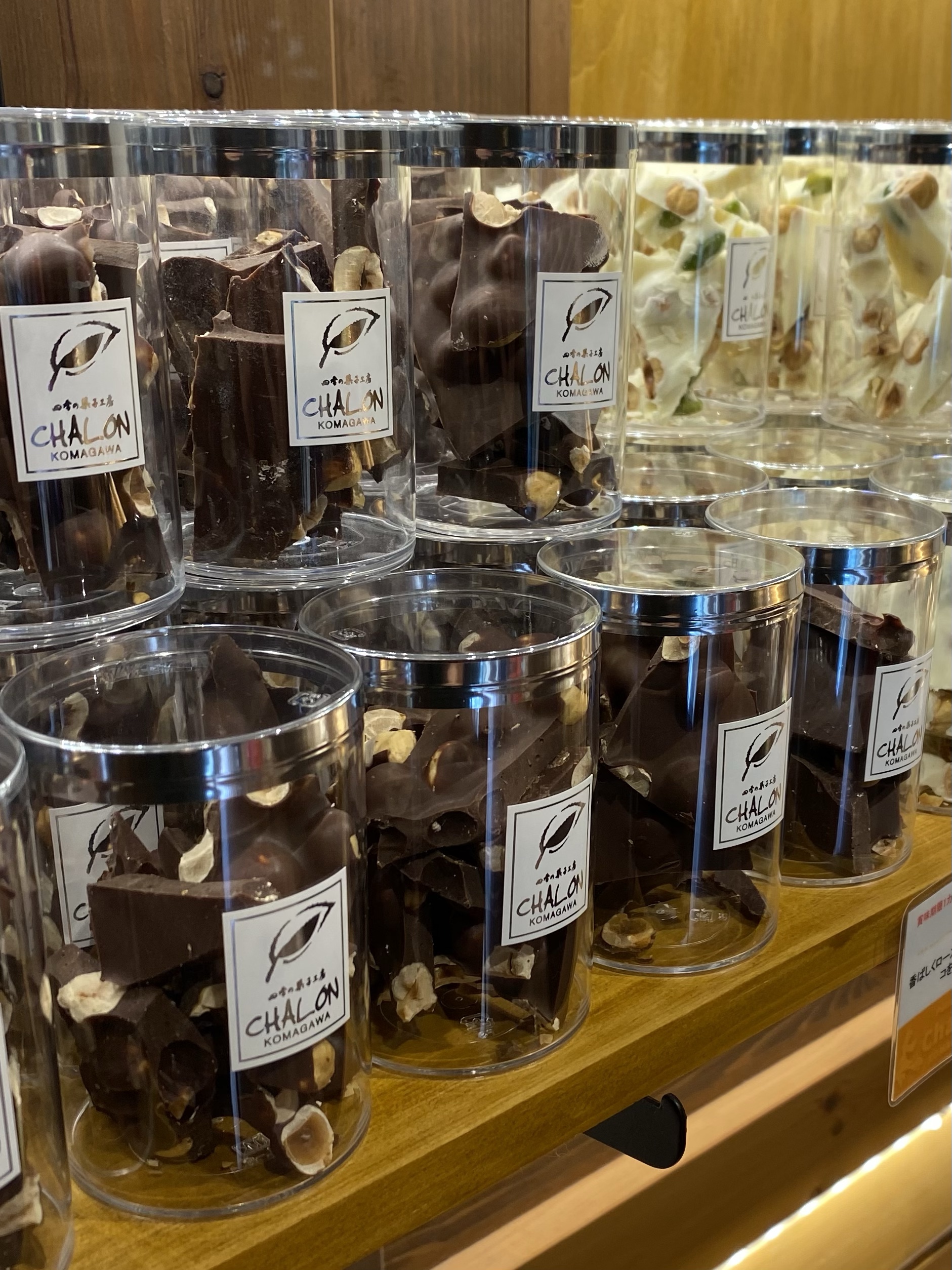 中でもおすすめなのは割チョコ、ナッツを入れたチョコをバキバキ割って円筒ケースに入れました。シンプルな組み合わせですが、色合いや味のバランスを大事にしています。