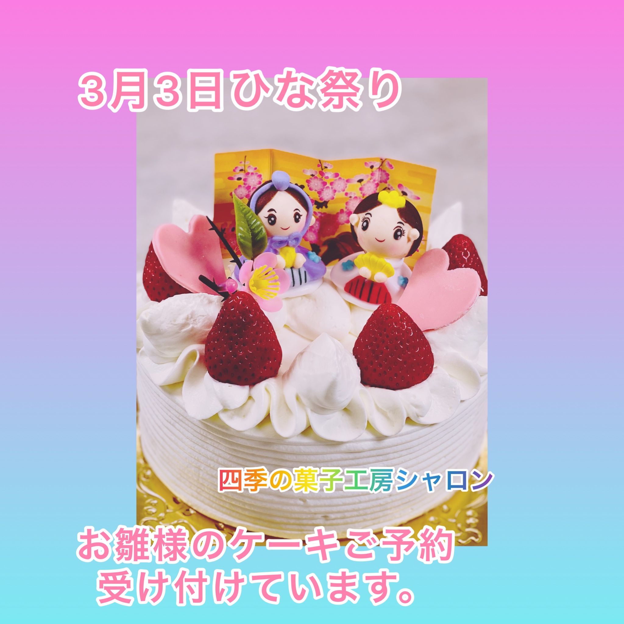 ひな祭りのケーキは通常のデコレーションケーキにプラス300円でひなバージョンになるのでお電話でご予約下さい。