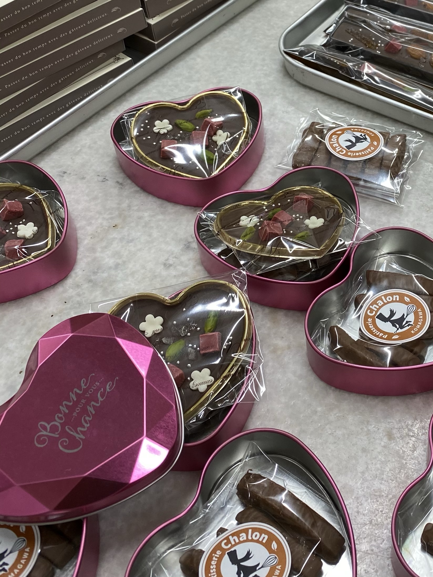 シトロネット(レモンの皮の砂糖漬けにチョコレートをかけた)と組み合わせて可愛らしいハート缶にいれました。