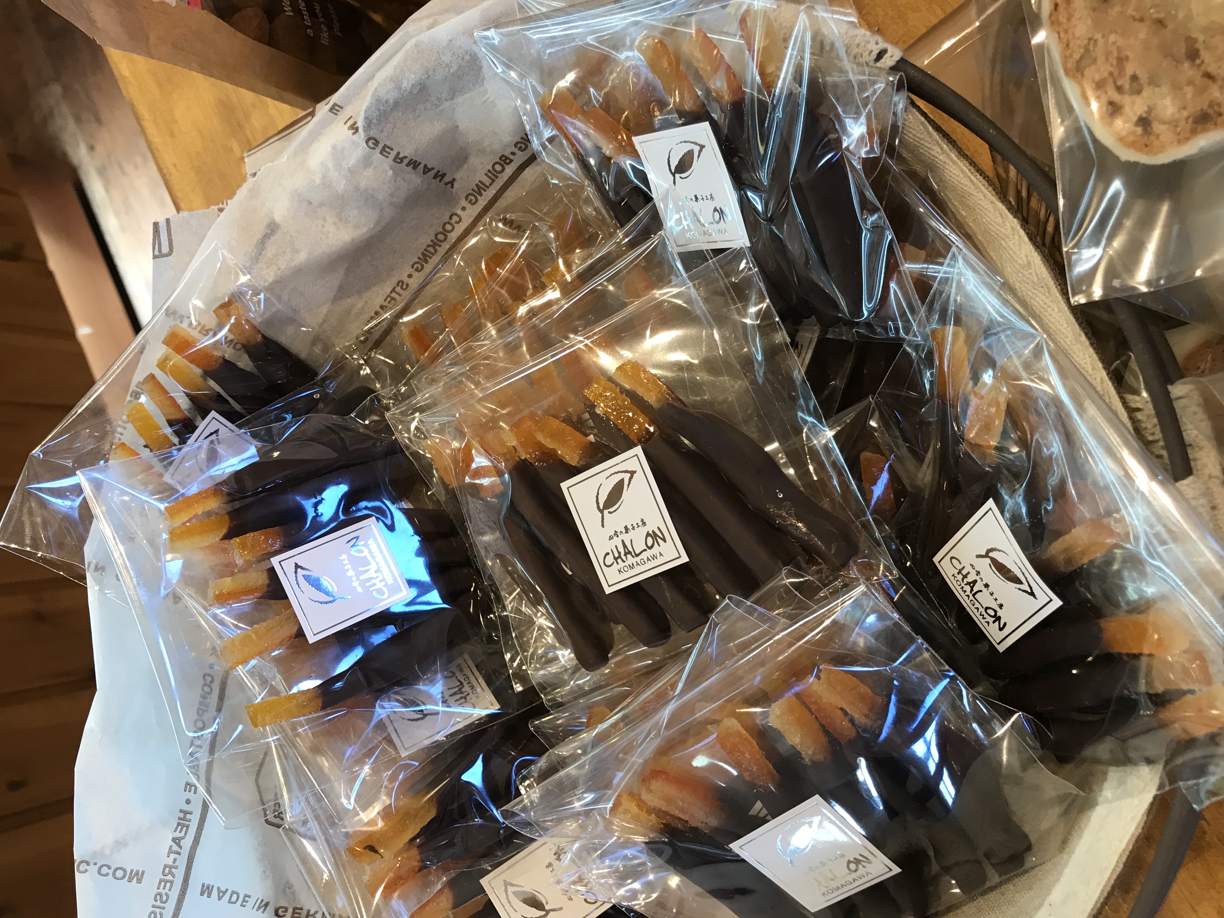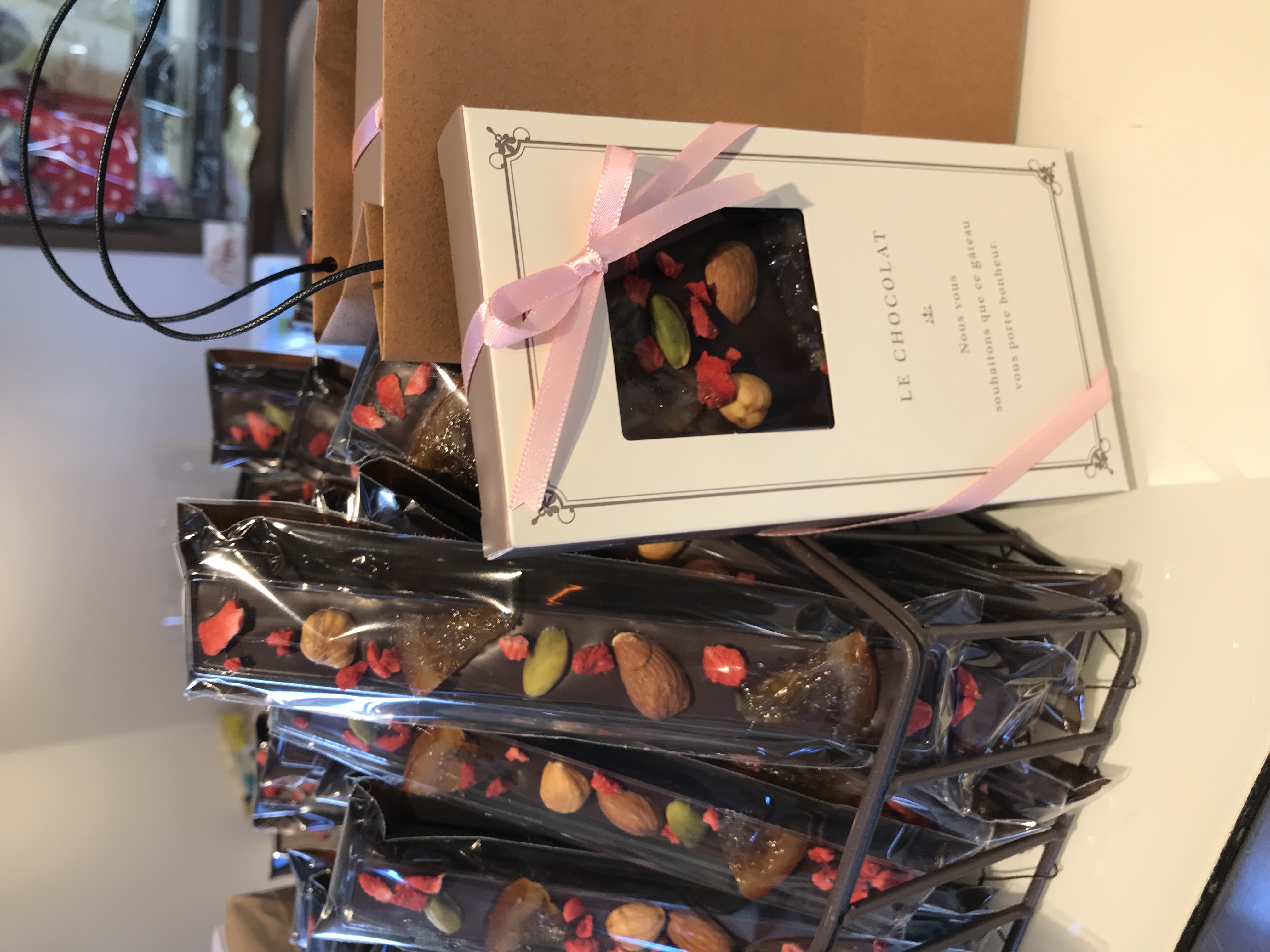 さあバレンタイン商品が出来てきましたよ!今年のおすすめはタブレットショコラ!苺やオレンジといったドライフルーツに色とりどりのナッツをちりばめたチョコレートです。かじる場所で色んな味が楽しめます!
