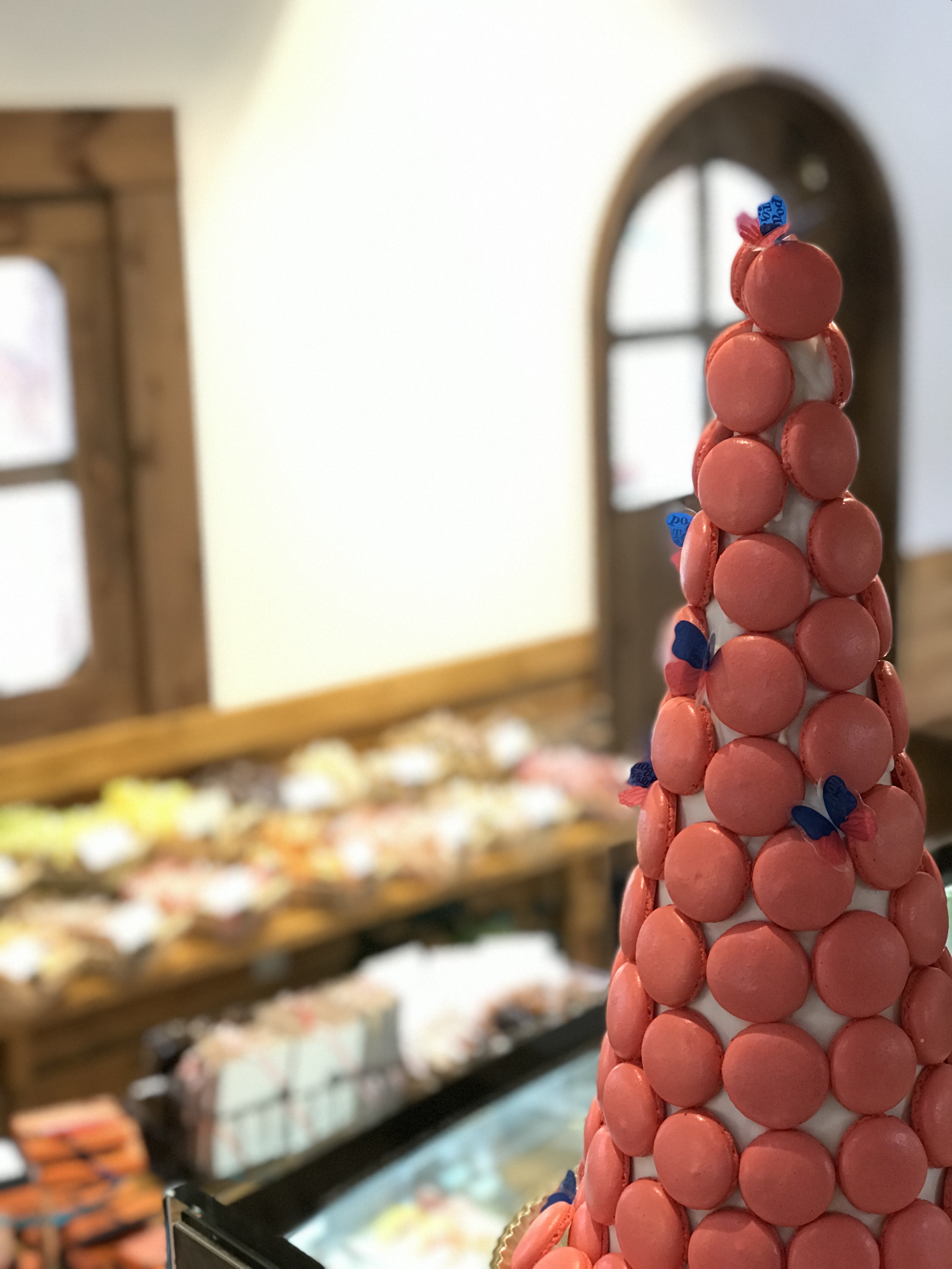 もうすぐバレンタイン‼️お店のディスプレイにマカロンタワーを作りましたよ!厚紙をクルクルって丸め、砂糖と卵白でグラスロワイヤルをつくり、マカロンをペタペタ^_^
