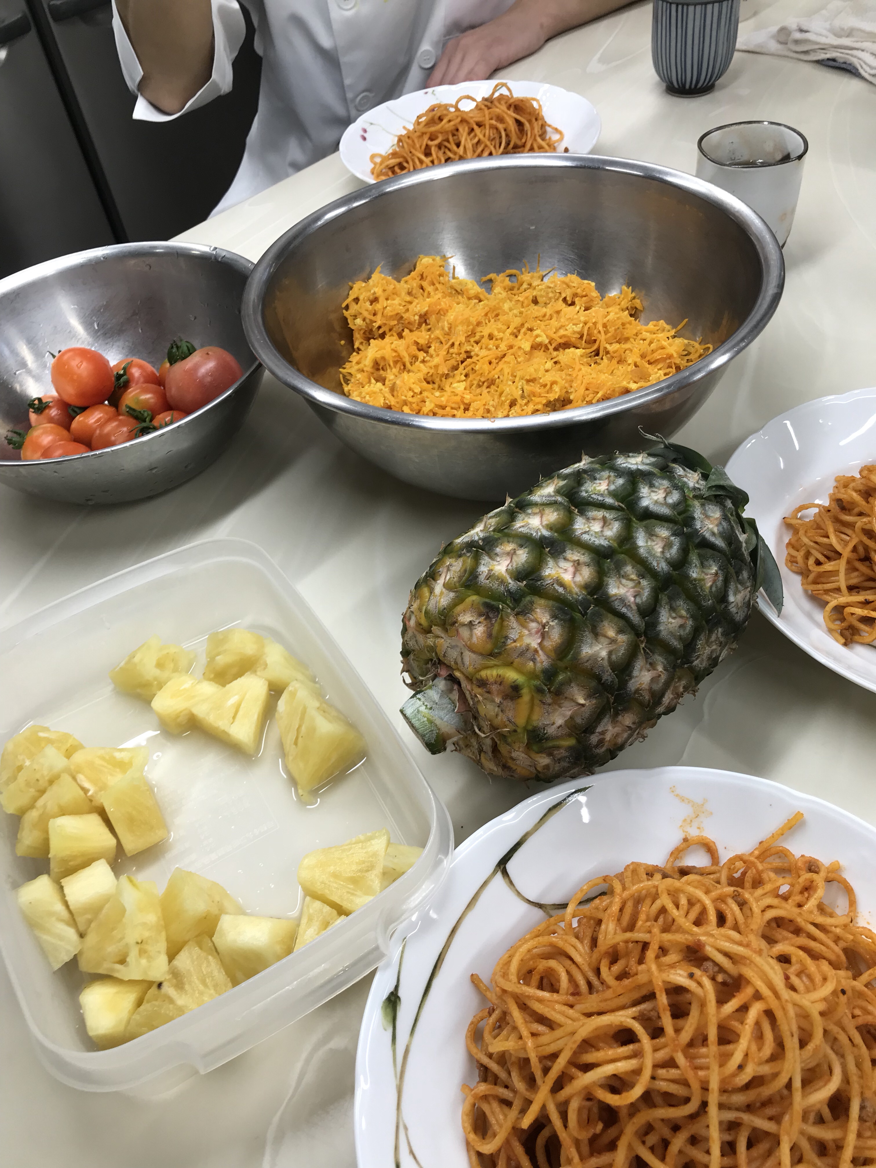 ぱっと見ナポリタンですが、ホットチリソースでスパイシー系、優しい味の人参しりしり、石垣産のパインと郷土色豊かなまかないになりました。絶品でした‼️